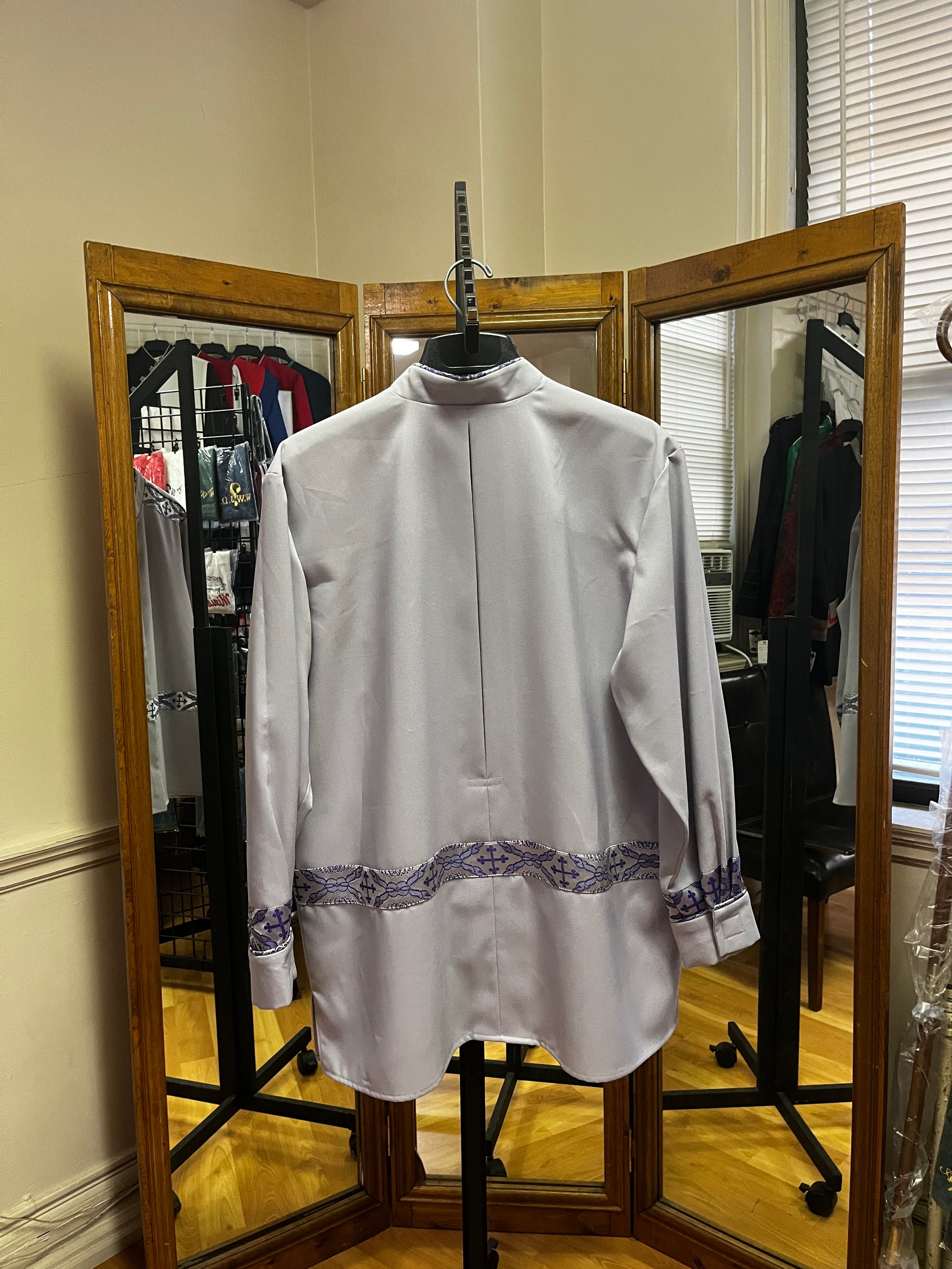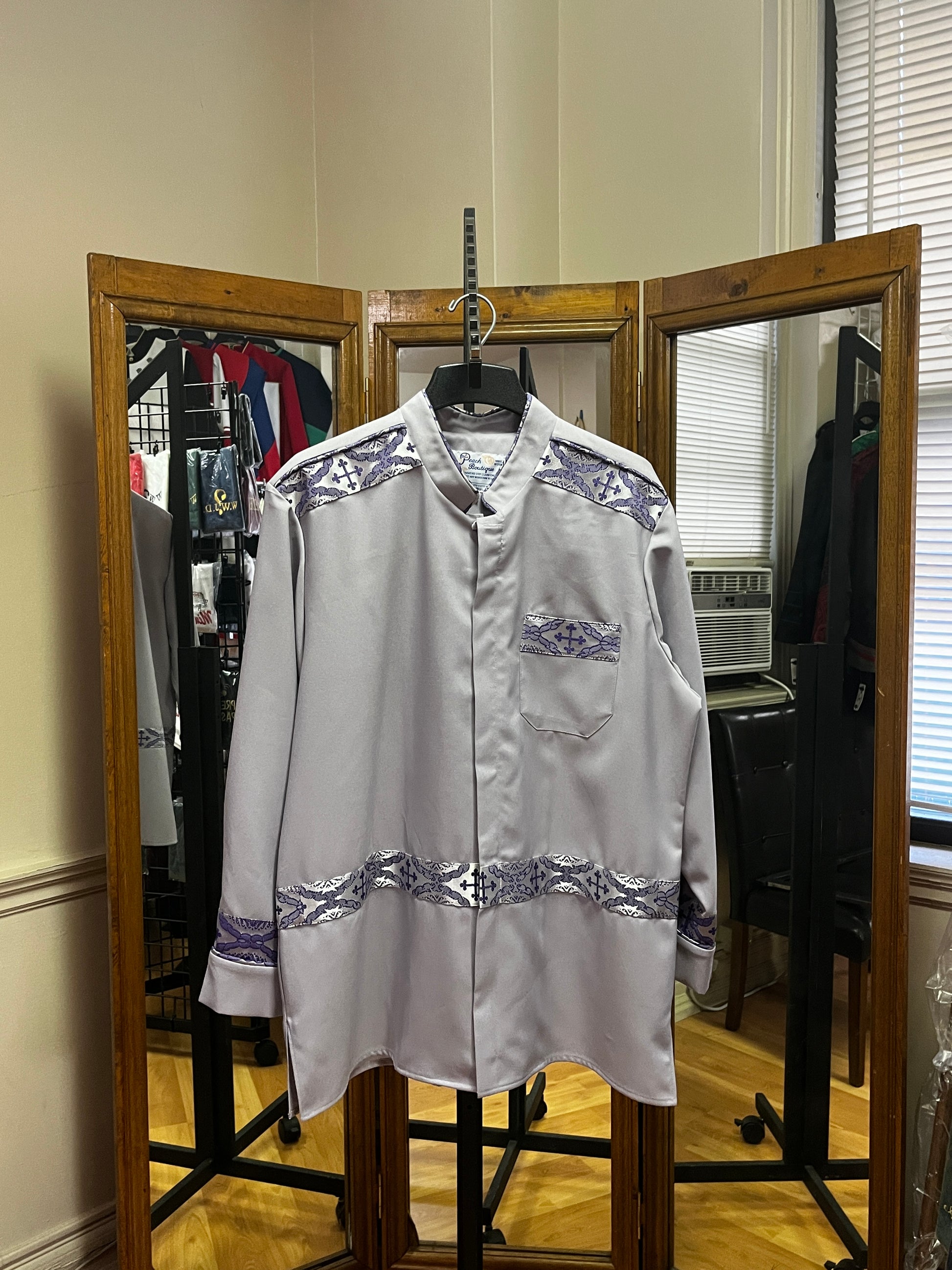 Gray poplin with silver and violet brocade, zip front, shirt-like jacket.
