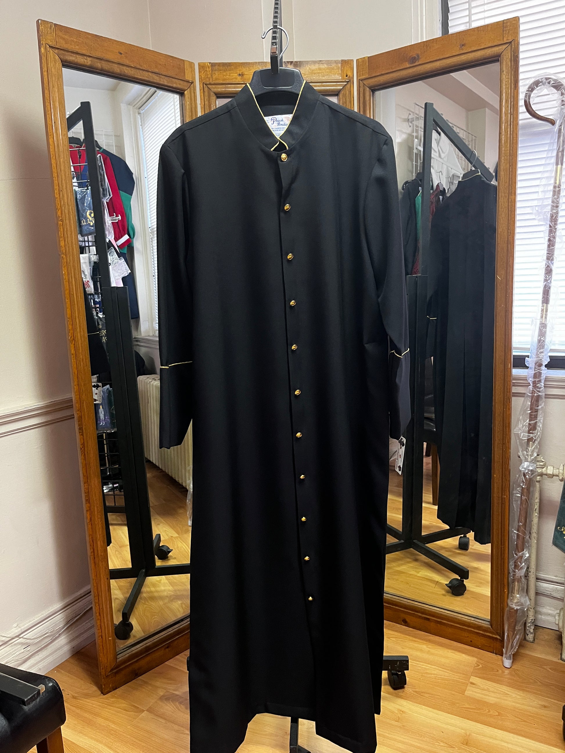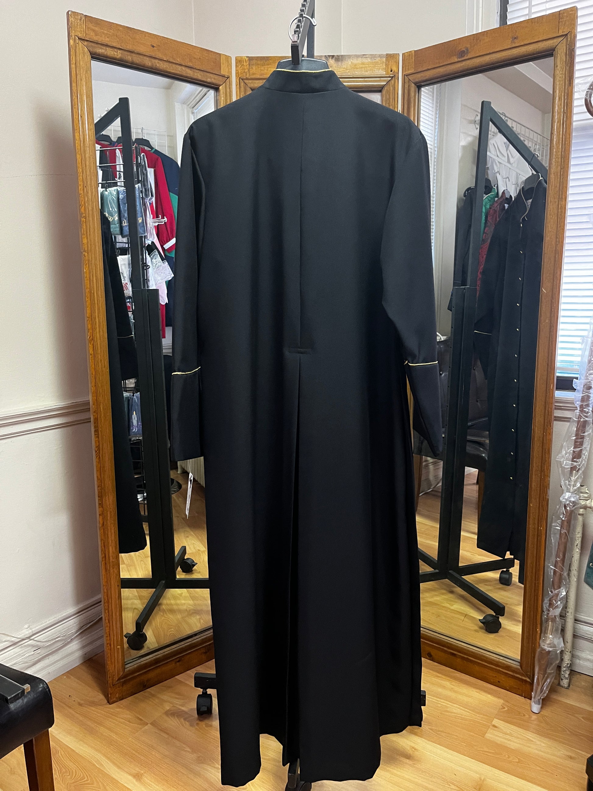 Black cassock with gold trim. Zip front.